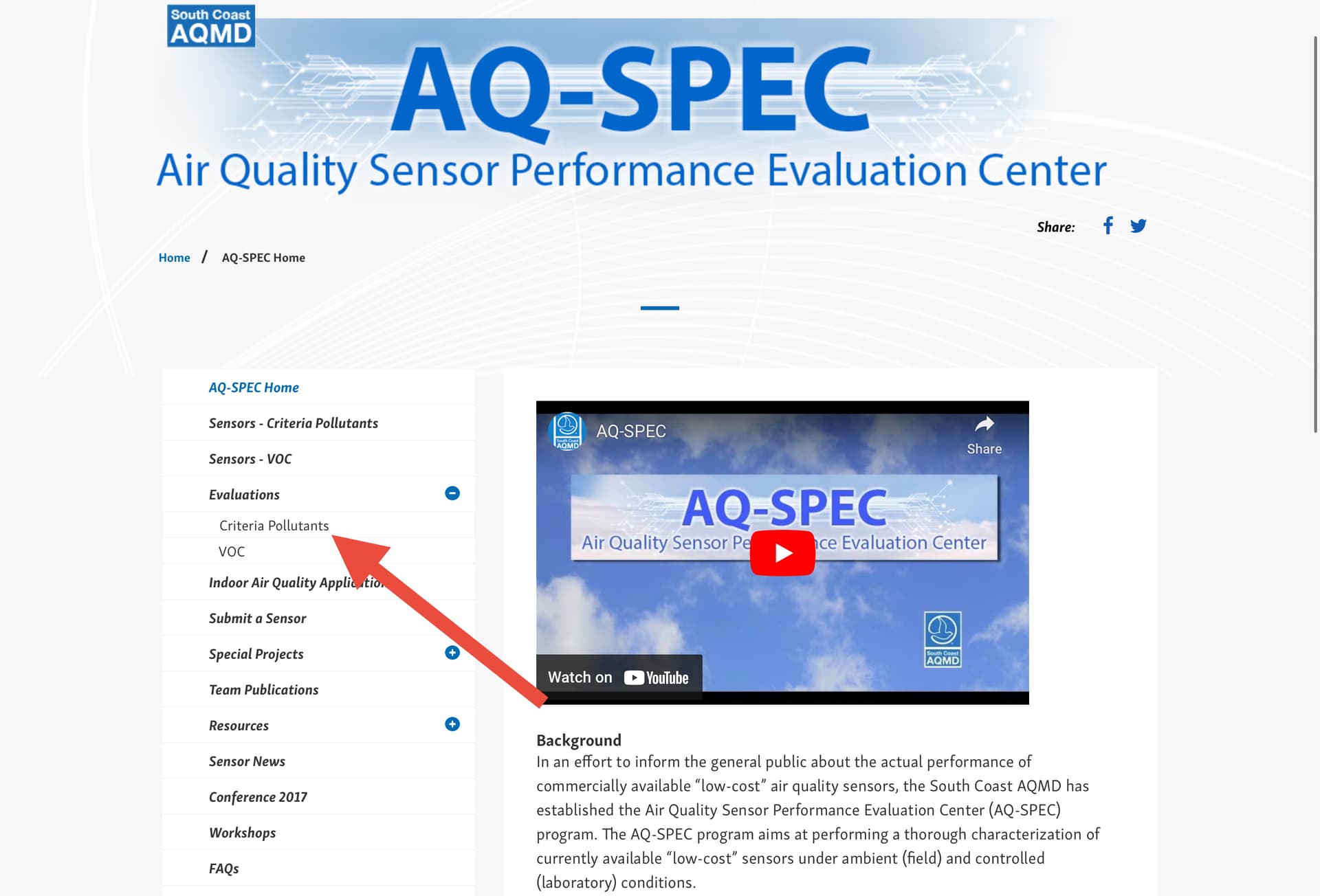 Once there, click on ‘Evaluations’ and then ‘Criteria Pollutants’.
