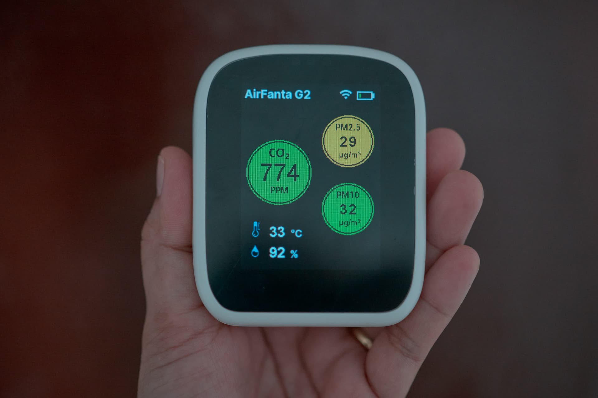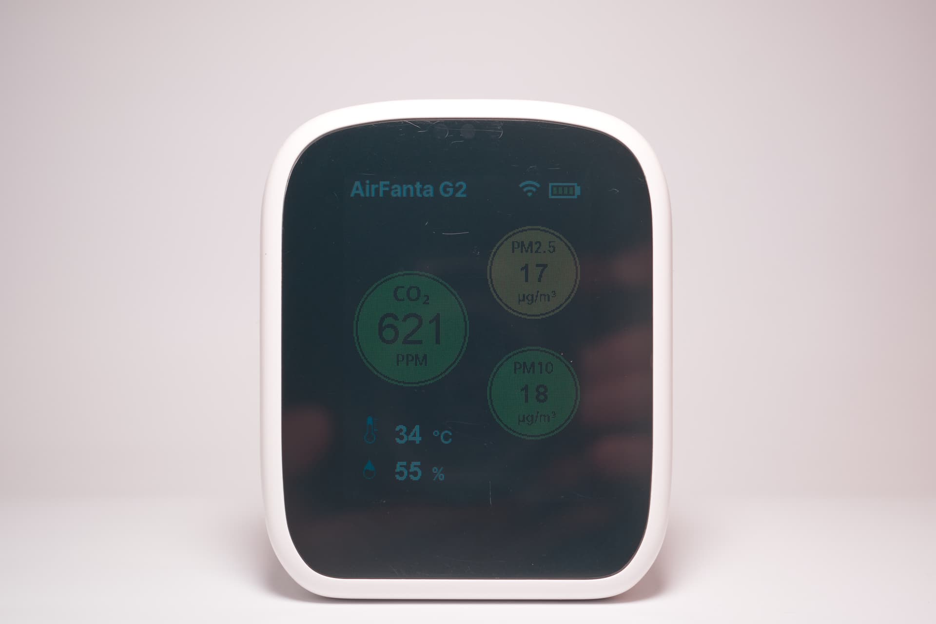 So, what exactly is the AirFanta G2? It’s a semi-portable air quality monitor that measures particulate matter (PM1.0, PM2.5, PM10), CO2, temperature and humidity. Why do I call it ‘semi-portable’? Technically speaking, it is fully portable because it’s both small and has an internal battery. However, I would classify it as ‘semi-portable’ because the battery life is relatively short (two to four hours, depending on if the screen is on). It also uses WiFi (not Bluetooth), so it will only send data to the cloud and then to your phone when connected to WiFi (in other words, at home).