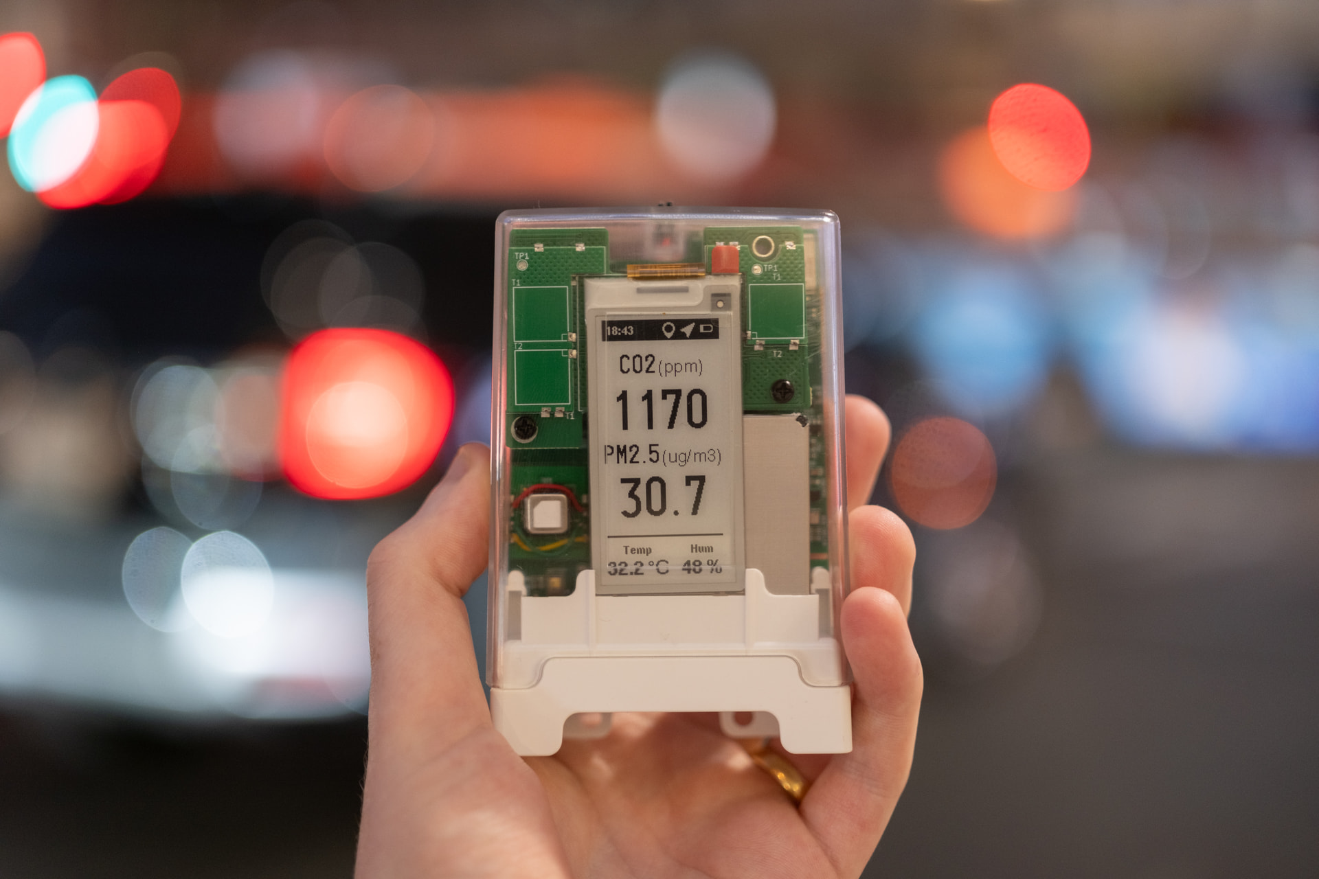 This device measures PM2.5 (Sensirion SPS30), CO2 (SenseAir S12), tVOCs and NOx (Sensirion SGP41), temperature and RH (Sensirion SHT40) and air pressure (Infineon DPS368). You can learn more about the device here: AirGradient Go Portable Air Quality Monitor.