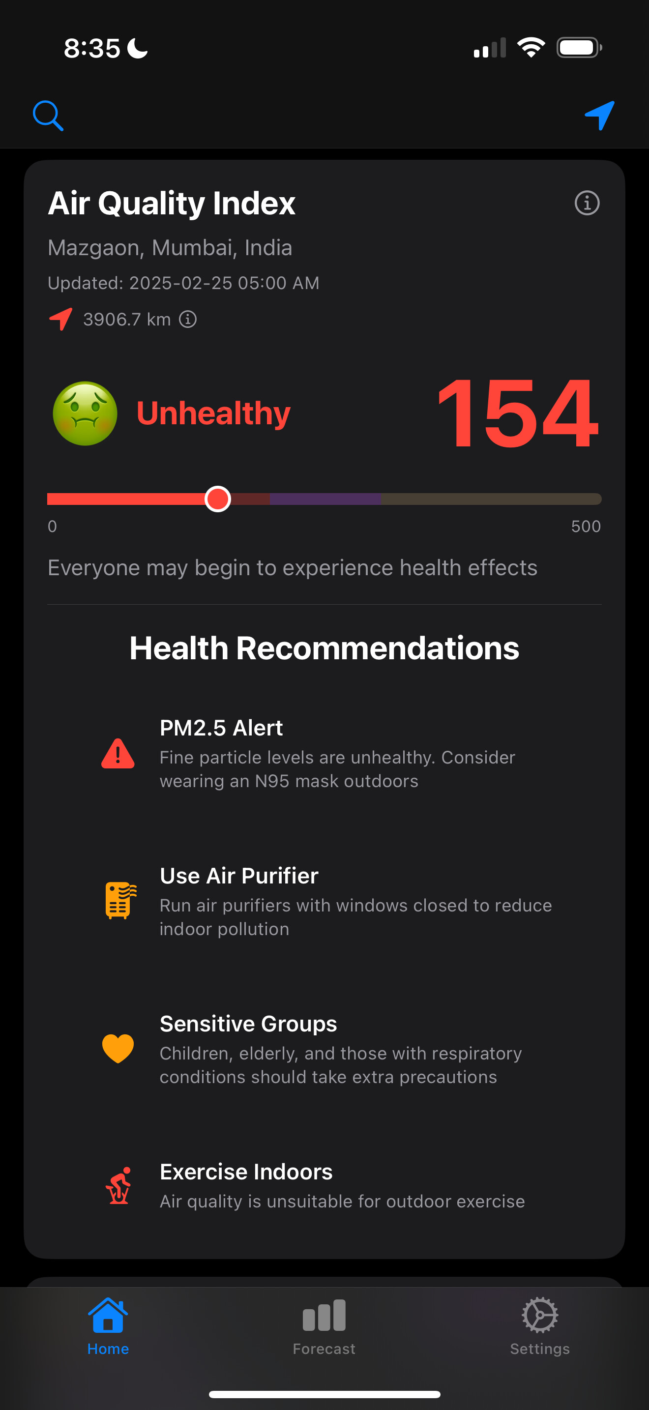 Here are a couple of screenshots of the home screen. You can see two examples of the AQI - one in Mumbai and one in Singapore. As you can see, the health recommendations are based on the current AQI. This is quite simple, but I also wanted to add a distance icon (the colour representing the confidence interval of the reading compared to my current location). As you can see, I am in Singapore, so the icon is green, indicating the reading is likely accurate to me. Mumbai is 4000km away, and not accurate to me) and an update time.