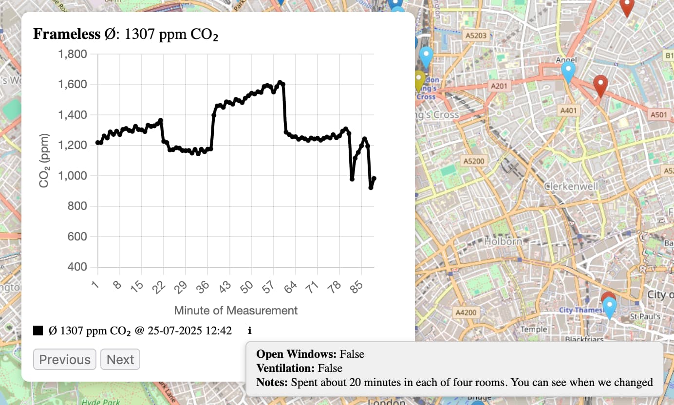 Indoorco2map.com is a bit different and focuses on collecting what I’ll call “research grade” data. Observations have to be at least 5 CO2 readings long (ie the sensor has to sample the air five times). On most sensors, that means the recording takes 5 minutes to do (although an Airspot set to a 5 second polling interval could do it in a minute). Its a drag to have to stand around in a shop for 5 minutes, but it does mean that the data is much more reliable and less noisy than Airspot and CO2trackers which only report a single CO2 reading (correct me if I’m wrong). Another benefit is that you can see how different parts of buildings have different levels of CO2 (see attached image as an example) and some of the longer recordings show how ventilation systems turning on and off affect the CO2 levels.