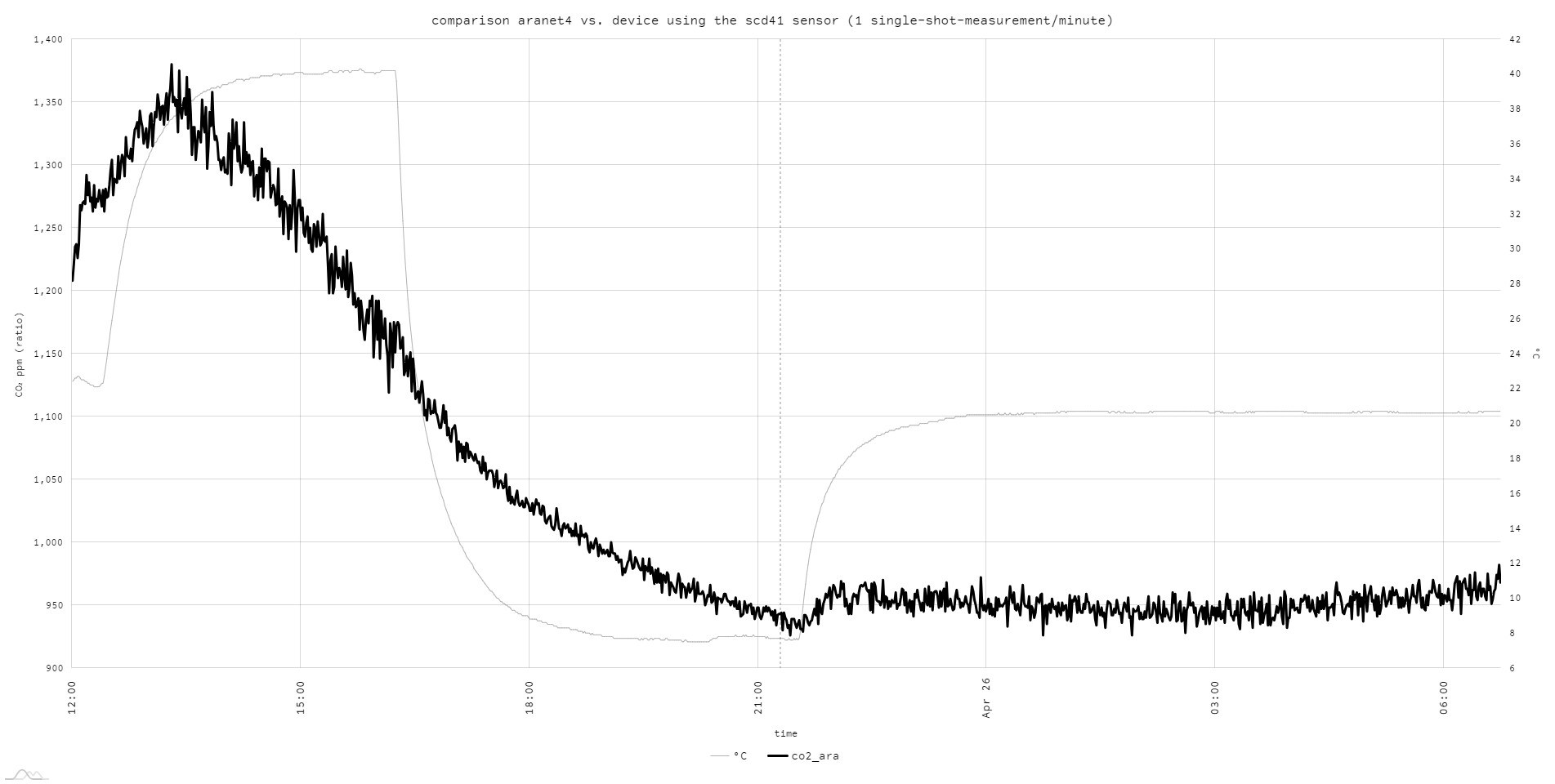As you can see, the SCD41 readings seem to be significantly impacted by temperature. The sensor consistently reads lower than the NDIR-equipped Aranet4 Homes at lower temperatures. At higher temperatures (above around 20 degrees Celsius), this swaps, and the SCD41 consistently reads higher - interesting!
