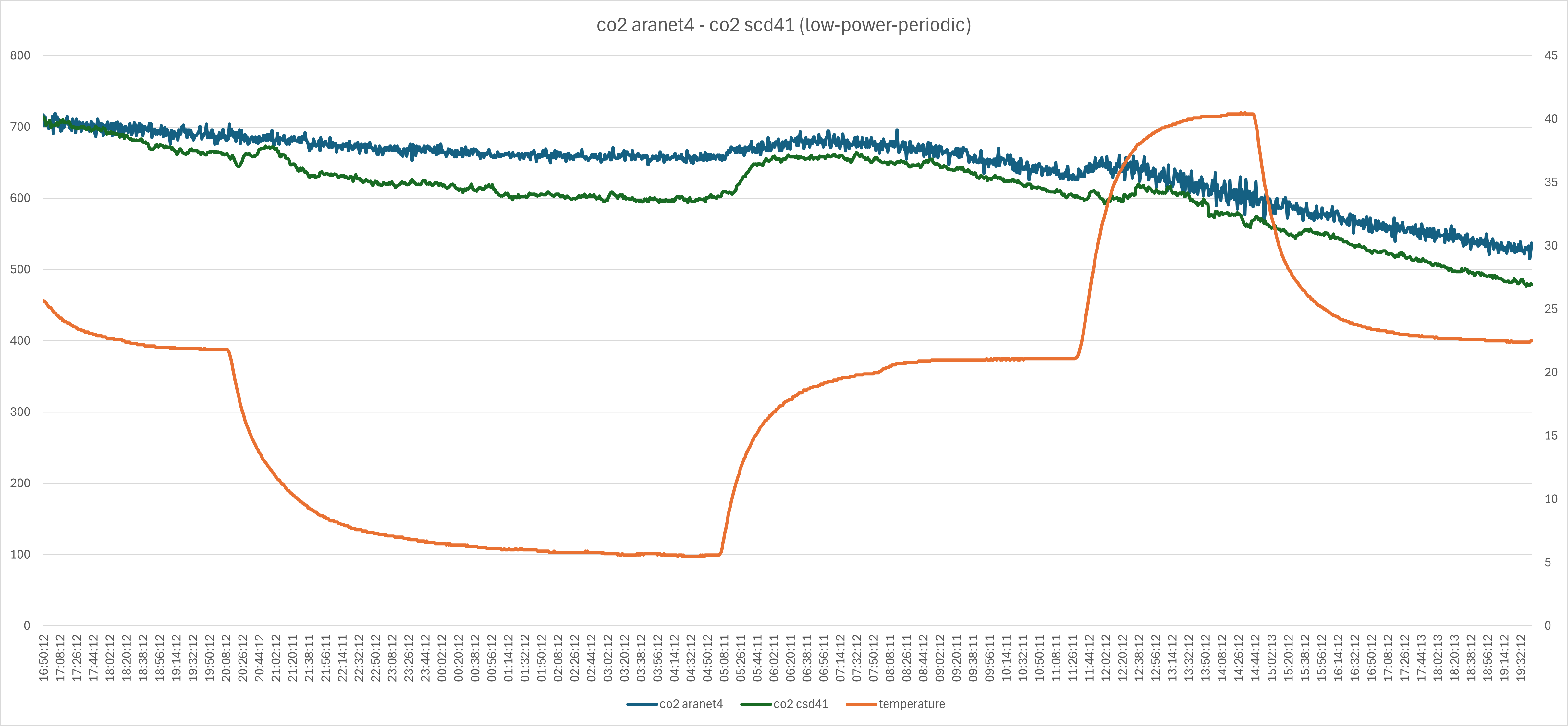 Of course, I also wanted to test the SCD41 at lower temperatures over 24 hours, which meant all three monitors had to go back to the fridge. Here are the results from that test: