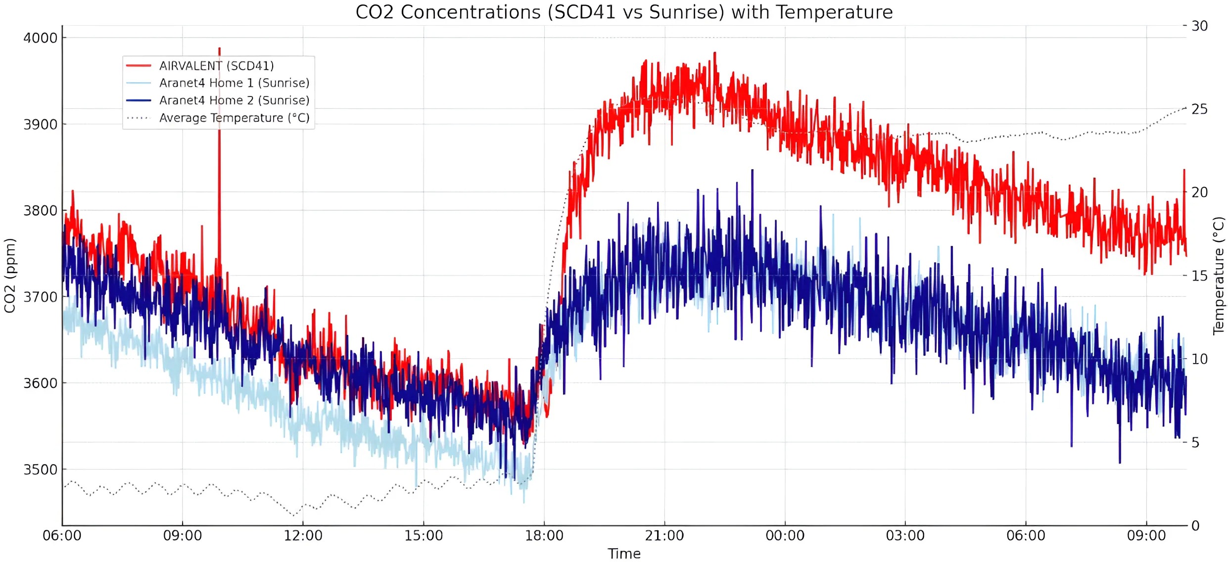 These graphs were all included in my full review of the AIRVALENT CO2 Monitor, but I wanted to dive deeper since I now have some more time to look into the matter. As such, I wanted to repeat the temperature tests but for longer periods of time to see if the results were consistent. Therefore, I took the three monitors out again the other day and decided to see how the SCD41 would perform. Again, I recalibrated all monitors in the same condition and placed them back into the plastic container. Below are the results over 24 hours at room temperature (I’m in Vietnam, so 25-30 degrees Celsius is typical indoors).